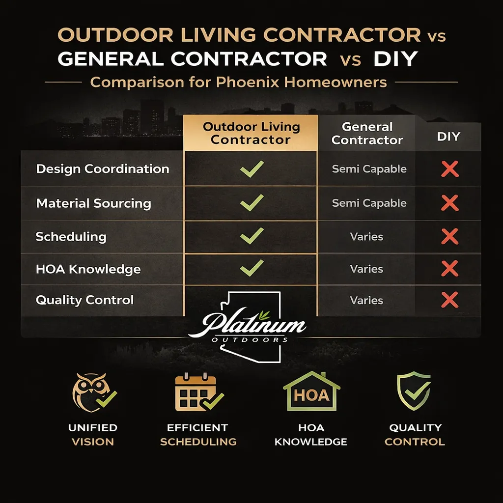 An outdoor living contractor specializes in designing and building complete outdoor environments—patios, shade structures, kitchens, lighting, and landscapes—specifically for exterior conditions. In Phoenix, where extreme heat, water restrictions, and HOA rules shape every project, choosing the right approach matters. This guide compares outdoor living contractors, general contractors, and DIY projects so homeowners can make informed planning decisions.